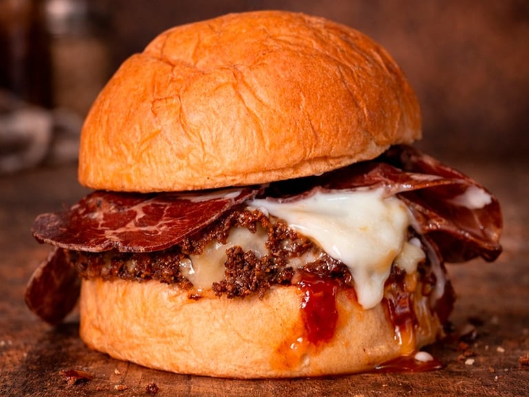 Cecina de Wagyu con una selección de dos quesos Ahumados por nosotros dan como resultado nuestra deliciosa Burger del Mes